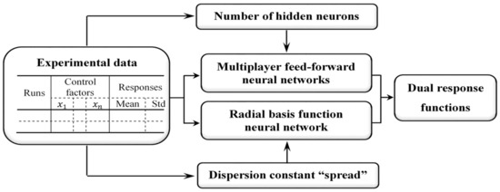 The primary motive of this research is to establish feed-forward NN structure-based estimation methods as alternative RD modeling approaches. First, an NN-based estimation framework is incorporated into the RD modeling procedure. Second, RD modeling methods based on the feed-forward back-propagation neural network (FFNN), cascade-forward back-propagation neural network (CFNN), and radial basis function network (RBFN) are proposed. These are applied to estimate the process mean and standard deviation response functions. Third, the efficiency of the proposed modeling methods is illustrated through simulation studies with a given real function. Fourth, the efficacy of the proposed modeling methods is illustrated through a printing case study. Finally, the results of comparative studies show that the proposed methods obtain better optimal solutions than conventional LSM-based RSM. The proposed estimation methods based on feed-forward NN structures are illustrated in Figure 1. From the experimental data, the optimal numbers of hidden neurons in the FFNN and CFNN structures and the dispersion constant “spread” in the RBFN are identified to finalize the optimal structures of the corresponding NNs. The DR functions can be separately estimated using the proposed estimation methods from the optimal NN structures with their control factors and output responses.