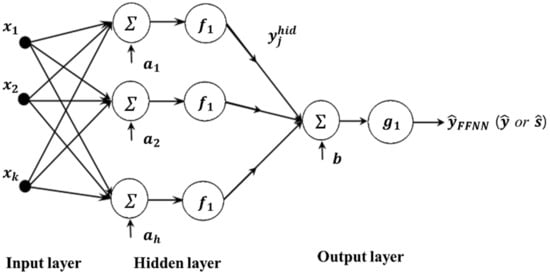 The input layer has control factors, , …, , …, . The input for each hidden neuron is the weighted sum of these factors plus their associated bias, expressed as . This calculated value will be transformed by a transformation function (), also called an activation function (expressed by Equation (5)). The transformed value is both the output of the hidden neuron and the input for the next layer (in our case, the output layer). Subsequently, the ultimate transformed outcome is the final result. The outputs of the hidden neuron and FFNN can then be expressed as