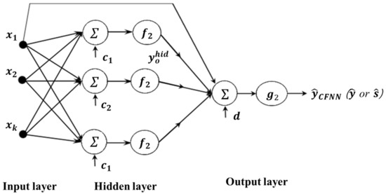 An alternative NN-based model, the cascade forward neural network (CFNN), has been shown to boost model accuracy and learning speed in cases with complicated relationships. CFNN is similar to FFNN, except that the former also includes a weighted link between the input and output layers. The additional connection means that the inputs can directly affect the output, which increases the complexity of the model but also increases its accuracy. Likewise, the CFNN model uses the BP algorithm to update the weights but has a drawback in that each layer of neurons is related to all previous layers of neurons [57]. The proposed CFNN-based modeling method is illustrated in Figure 4. The output of CFNN is expressed as follows: