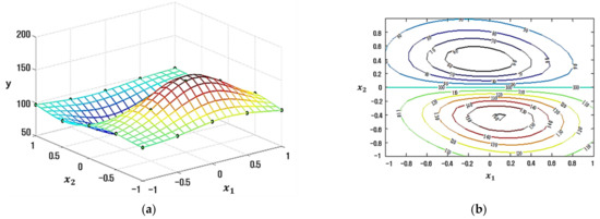 The statistical estimation method of RSM based on conventional LSM, as introduced by Box and Wilson [47], generates the response surface approximation using linear, quadratic, and other functions, while the coefficients are estimated by minimizing the total error between the actual and estimated values. For a more comprehensive understanding of RSM, Myers [48] and Khuri and Mukhopadhyay [49] discuss the various development stages and future directions of RSM. When the exact functional relationship is unknown or very complicated, conventional LSM is typically used to estimate the input-output functional responses in RSM [50,51]. In general, the output response can be identified as a function of input factors as follows:
