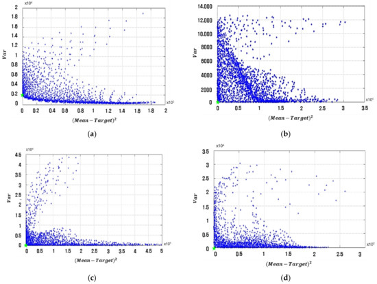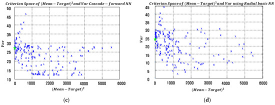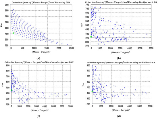 The results in Table 5 clearly show that the proposed RD modeling approach with the three NN architectures produces much smaller EQL values than the approach using LSM-based RSM. Specifically, both the process bias and variance values obtained from the proposed NN-based model are significantly lower than those of LSM-based RSM. The squared process bias vs. variance results of the conventional LSM-based RSM and proposed FFNN-, CFNN-, and RBFN-based modeling methods in simulation study 1 are illustrated in Figure 11. The optimal settings are marked with green stars in each figure.