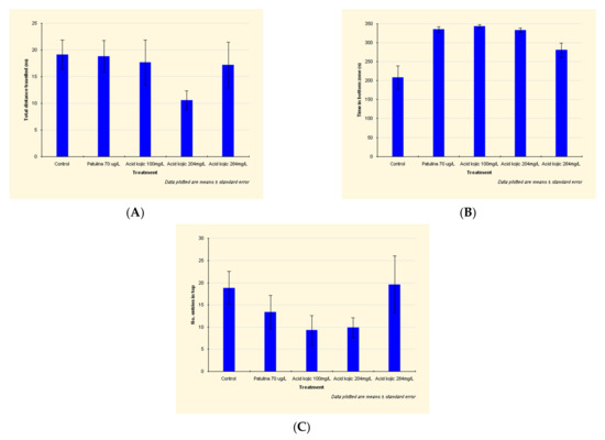 Effects of patulin (PAT, 70 µg/L) and kojic acid (KA, 100 mg/L, 204 mg/L and 284 mg/L) on the behavioral parameters ((A) Total distance traveled; (B) Time in bottom zone; (C) No. of entries in top zone) in zebrafish submitted to a novel tank diving test. Data are expressed as mean ± S.E.M. (one-way ANOVA, n = 20).