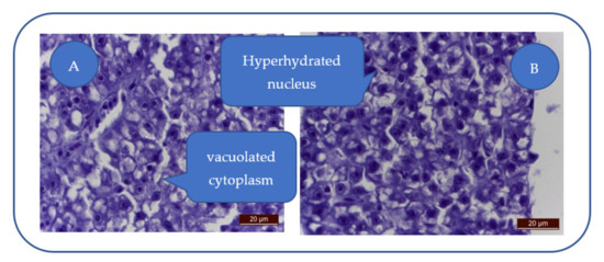 Severe hepatocyte alteration. (A) Swollen hepatocytes with vacuolated cytoplasm and triglyceride loading; (B) Hydropic and lipidic dystrophy hepatocytes; hyperhydrated nucleus.