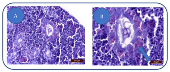 The 284 mg/L kojic acid-treated group exhibits moderate kidney toxicosis: swelling of the tubular epithelium and tubular lumens disappearance (Figure 6C). The nephrocytes are swollen with abundant cytoplasm, hypertrophied nuclei and prominent nucleoli.