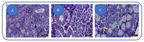 Following exposure to 100 mg/L kojic acid, we have remarked a moderate degeneration of the proximal and distal urinary tract, noted by moderate alteration of the epithelium (Figure 6A). Nephrocytes are slightly swollen, have a granular cytoplasm, and the nuclei are hyperhydrated. Tubular lumens are slightly reduced.