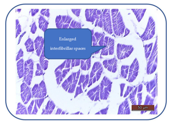 After 100 mg/L kojic acid exposure, we have noticed cardiac muscle fibers degeneration and perinuclear sarcoplasm vacuolization (Figure 8). There is also a moderate to severe myocardial congestion, characterized by ectasia and erythrocyte overload of the interstitial capillaries.