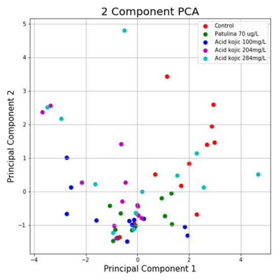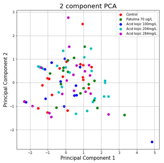 After this period, the animals were divided into 5 groups: control (nothing was administered), patulin 70 μg/L, kojic acid 100 mg/L, kojic acid 204 mg/L, and kojic acid 284 mg/L.