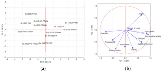 Figure 1 shows the results of principal component analyses (PCA) for the quality parameters of yeast strains after rehydration in the presence of individual waters (PTWAir, PTWN, CW). The first principal component PC1 described 33.54% of the total variance, while the second (PC2) described 24.16%. Positive PC1 loads were related to glycogen and glycogen after fermentation; negative loads were related to trehalose and trehalose content after fermentation. For PC2, positive loads were for acidity and the number of yeasts, while the other parameters had negative values. In the presented studies, the statistically significant results depend mainly on different used yeast cultures; however, they could also depend on the time of storage of individual yeast strains. The rehydration medium only slightly contributed to the presented results. Significant differences were noticed in the case of the PTWN medium, which also depended on the yeast strain. Sc US-05 strain was characterized by a relatively high glycogen content compared to the other samples. Sp W30/70 strain had high trehalose content and flocculation ability. In contrast, Sc T58 strain had significantly higher saccharolytic activity, as well as glycogen after fermentation.
