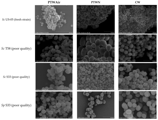 Yeast suspensions after rehydration with PTWAir, PTWN and CW were conducted in Eppendorf tubes (capacity of 1.5 mL), pre-washed with 0.1 M phosphate buffer and allowed to stand with 3% glutaraldehyde for 24 h at room temperature. Then, the sediments were again washed with 0.1 M phosphate buffer and allowed to stand with 2% OsO4 for 4 h, washed with 0.1 M phosphate buffer, and dehydrated in an aqueous-alcoholic series (50%, 60%, 70%, 80%, 90%, 96%, and 100% for 10 min treatment and centrifugation, 2075× g, 3 min) and acetone (15 min). The dried specimens were applied to a graphite sticker, placed on an aluminum table, sputtered with gold (65 s) and observed using a scanning electron microscope (Hitachi VP-SEM S-3400N, Tokyo, Japan, accelerating voltage 25 kV, SE detector).