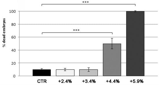 Mortality rate of embryos grown under different increases in hydrostatic pressure (HP) from 0% (CTR) up to 5.9% evaluated at five days post fertilization. Hydrostatic pressure increase is indicated to be safe for embryos up to 3.4%, whereas a 4.4% HP increase enhances the mortality at 49%. Further, a 5.9% HP increase is lethal for all embryos (CTR vs. +4.4% HP, *** p < 0.001; CTR vs. 5.9% HP, *** p < 0.001).