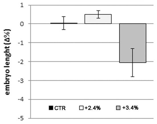 Difference of length (Δ%) in 5 dpf embryos grown under different increases in HP from 0% (CTR) up to 3.4%. Embryos grown under +3.4% HP show a statistically non-significant reduction in body length (CTR vs. +3.4%, −2%).