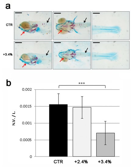 (a) Alcian Blue/ARS staining highlights a decreased number of mineralized vertebral bodies (black arrow) and a delayed chondrogenic mineralization of lower jawbone (red arrow) in +3.4% HP embryos. Scale bar: 200 μm. (b) Vertebral mineralization rate of five days post fertilization embryos grown under different increased HP from 0% (CTR) up to 3.4%, evaluated as a ratio of the number of vertebral bodies positive for ARS staining along the length of the fish body (N.V./L.). Embryos grown under +3.4% HP showed a statistically significant variation in N.V./L. (CTR vs. +3.4%, *** p < 0.001, −54%).
