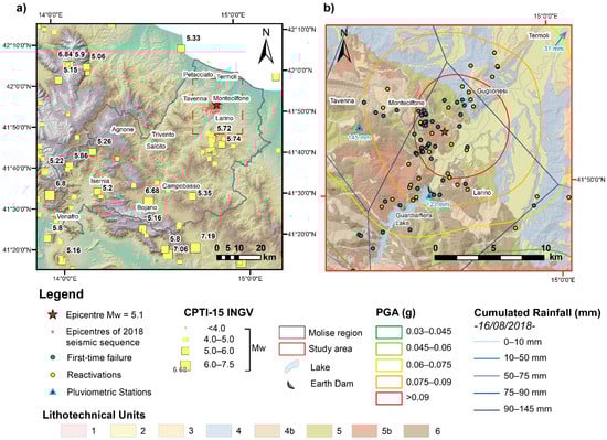 (a) Physiography of the Molise region with locations and magnitudes of historical earthquakes in the area according to the CPTI15 catalogue [31]; location of the study area struck by the 2018 seismic sequence is highlighted by the red dashed line. (b) Distribution of ground effects surveyed and inventoried in the CEDIT catalogue [32] with respect to outcropping lithotechnical units, PGA, and cumulated rainfall in the Thiessen polygons. Outcropping lithotechnical units include: (1) landslide deposits; (2) fluvial and terraced deposits; (3) calcarenites; (4) blue clays; (4b) pelitic flysch; (5) marly clays; (5b) scaly clays; (6) arenaceous flysch. Location of the Liscione earth dam is also reported.