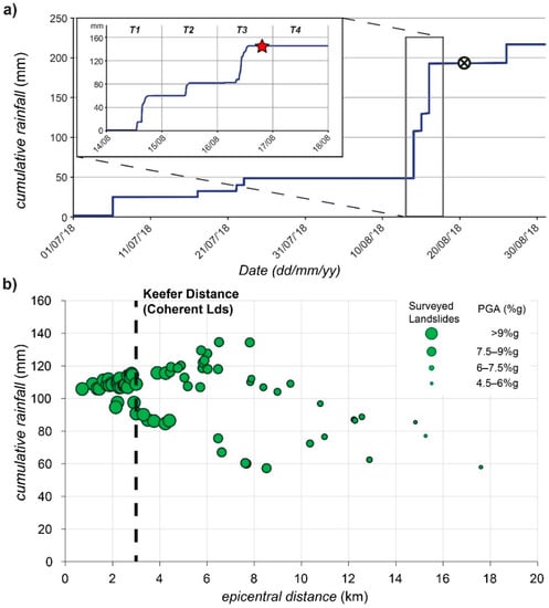 (a) Cumulative rainfall values recorded between 14 August 2018 and 17 August 2018 at Palata weather station. In the epicentral area, the rainfall event ended before the seismic shaking. The seismic event and the date of surveys are reported by the red star and black circle, respectively. (b) Coherent landslides distribution related to rainfall and peak ground acceleration. Keefer distance for coherent landslides is also reported (Modified from [20]).
