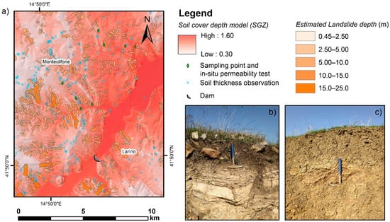 (a) Map of the soil cover depth developed according to the SGZ model. Estimated landslide depth, inferred through area vs. volume relationship proposed by Guzzetti et al. [40], is also reported. Minimum (b) and maximum (c) endmembers of weathered soil cover visible in outcrops are shown.