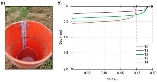 (a) In situ Lefranc tests were carried out in the soil cover to constrain the permeability of the unsaturated shallow covers adopted for the 1D infiltration modelling carried out in Hydrus-1D [42]. (b) Curves representing the saturation profiles over time and in-depth for the lithotechnical unit coded 1 and assuming rainfall registered at the Liscione weather station. Time stages: T0 start of rainfall; T1 = 23:59—14 August 2018; T2 = 23:59—15 August 2018; T3 = 23:59—16 August 2018; T4 = 23.59—17 August 2018.