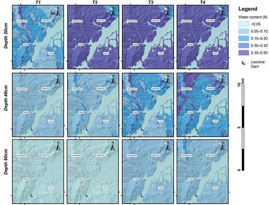 Maps show the variation of the water content at different depths over time within the shallow altered soil covers.