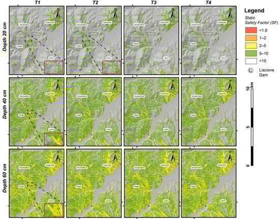 The static SF values obtained by the slope stability analysis at 20–40–60 cm b.g.l. reflect the different saturation profiles and pressure heads in the soil cover (Figure 7), whose stability is directly dependent on the counterbalancing of suction stabilization and soil weight destabilization. For constant depth and lithotechnical properties, values of the static SF increase as the suction stress increases (more negative), as it results in an effect of “apparent cohesion” in shallow cover stability [52,53]. Minimum SFs were maintained where the suction stress values were lower. By increasing the time, the static SF decreases weakly with increasing rainfall from T1 (14 August 2018) to T2 (15 August 2018). After T2, the water content remains unchanged, especially at 20 cm depth, and there are no more clear variations in the value of the static SF. By increasing the depth, the reduction of the static SF become more visible (60 cm depth in Figure 7).