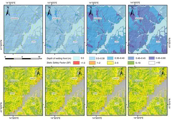Maps showing: static SF at the maximum depth of soil covers considering absence of rainfall (top-left); static SF at the maximum depth of soil covers considering partially saturated conditions due to rainfall (top-right); difference between SF obtained by the two conditions (bottom-left); depth of infiltration level (bottom-right).