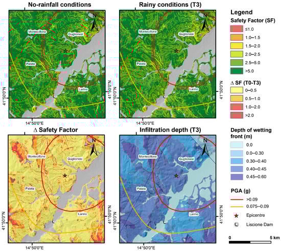 Comparing the SF maps in dry and rainy conditions (Figure 9), obtained assuming the mobilization of the entire thickness of the soil covers, it is possible to see how the infiltration tends to lower the value of the SF, bringing some areas close to the unit value. The presence of infiltration water would have weighed approximately uniformly over the entire study area, reducing the SF by decimals up to units depending on the wetting front depth reached (Figure 9). However, the areas of maximum rainfall and greater infiltration depth are found in the zones with a lower PGA (peripheral areas), confirming that the rainfall has played mostly an aggravating role in the reduction of the stability conditions but did not act as a trigger.