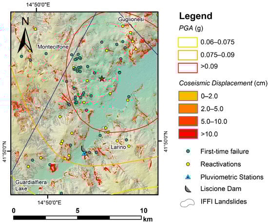 Regarding the coseismic displacement analysis, it was observed that the earthquake was actually sufficient to induce coseismic displacement greater than the critical threshold of 10 cm (Figure 10), considered in literature enough to assume instabilities for flow and slide mechanisms in cohesive soils [49,55,56].