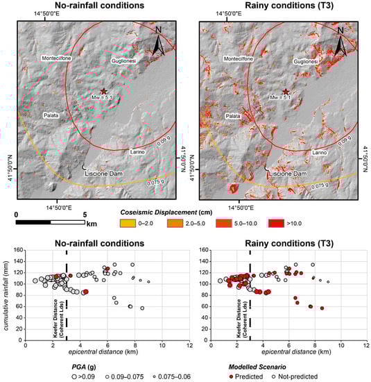 Referring to the DB of induced ground effects surveyed in the CEDIT catalogue, the back analysis shows good performance resulting in critical coseismic conditions for 13 out of 47 first-time failure locations and 21 out of 28 points where landslide reactivations were registered (Figure 10). Most of the landslides predicted in the here modelled scenarios fall into the Keefer distance for coherent slides where the maximum seismic load occurred (Figure 11—rainy conditions), however several landslides have been activated at greater epicentral distances where the maximum rainfall was registered.