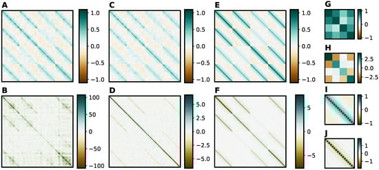 Using Equation (14) removes the need to calculate the full, high-dimensional Kronecker product . Figure 1E,F show examples of the structured covariance and inverse covariance estimators, respectively, consisting of a spatial Kronecker factor (Figure 1G,H) and a temporal component (Figure 1I,J).