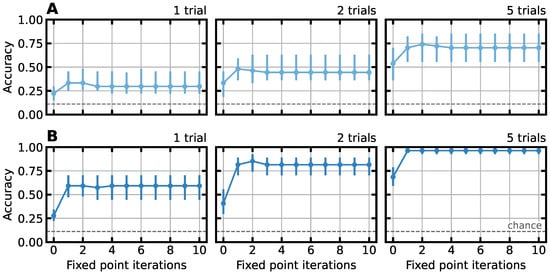 Average cross-validated stbf-struct accuracy using one trial per block for validation over all 21 subjects relative to the number of iterations used to estimate the Kronecker–Toeplitz-structured shrunk covariance. Error bars represent the first and third quartiles. The accuracy does not improve when using more than one iteration. (A) Results for 1, 2, and 5 trials using only the first block in each training fold for training. (B) Results for 1, 2, and 5 trials using all nine training blocks in the training folds.