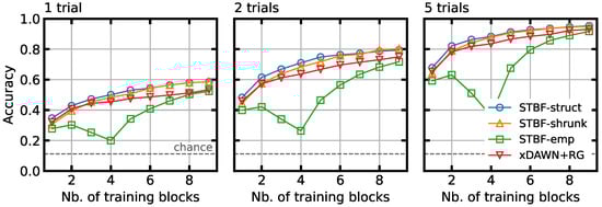 Another observation is the significantly better accuracy score of stbf-struct over stbf-shrunk when the amount of available training data is small. This property is an attractive advantage in a BCI setting since it is desirable to keep the calibration (training) phase as short as possible without losing accuracy. The accuracy advantage of the structured estimator is a consequence of the Kronecker–Toeplitz covariance structure, which is informative for the underlying process generating the epochs, if it is assumed that the EEG signal is a linear combination of stationary activity generated by random dipoles in the brain with added noise [,,]. Hence, stbf-struct can utilize this prior information to better estimate the inverse covariance. The increase in accuracy for small training set sizes can also be explained by the smaller number of parameters necessary to estimate the inverse covariance (see Section 4.2), increasing the stability of matrix inversions.