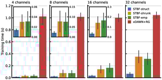 Figure 4 shows that the training time of stbf-struct increased less steeply than that of stbf-shrunk and stbf-emp. The training time of all three STBF-based classifiers was much lower than that of xdawn+rg, which appears nearly constant when using 4, 8, 16, or 32 channels.