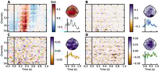 LCMV-beamforming was initially introduced to EEG analysis as a filter for source localization [] to enhance the signal-to-noise ratio (SNR). Van Vliet et al. [] first applied the spatiotemporal LCMV-beamformer as a method for the analysis of ERPs. The extension of this method to the combined spatiotemporal domain [] and the data-driven approaches proposed by Treder et al. [] and Wittevrongel et al. [] allow for its application to classification problems.
