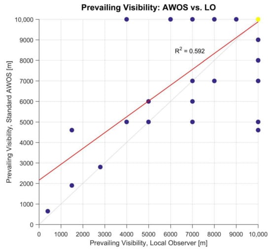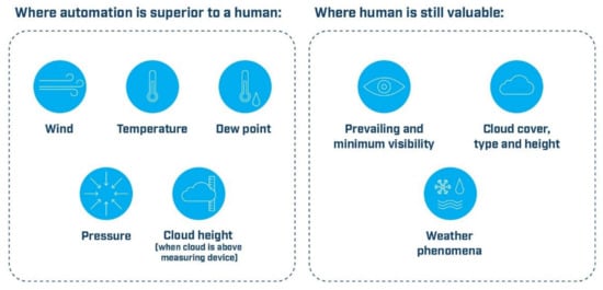 Needs for efficiency in airport operations and quality requirements put pressure on the performance of the airport Automated Weather Observation System (AWOS) at all ranges of airports from the small to the largest ones. Nevertheless, 24/7 human observations carried out locally at small or medium airports may not be sustainable economically: providing the necessary local staff to operate such an airport can be challenging and costly. Therefore, observations of the current weather by professional observers in these locations are often completely or partially replaced by simplified ones. Replacement by the way of reporting from a human-based to a standard, automated, and point sensor-based one, especially when reporting prevailing visibility and cloud coverage, however, may have quality issues and may cause risks mainly in case of hazardous weather phenomena in the airport vicinity or reduced visibility at critical distances (Figure 1).