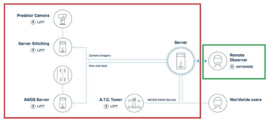 The basic workflow of the system and its components at the Poprad-Tatry Airport (ICAO: LZTT; IATA: TAT) is visualized in Figure 3. The red rectangle denotes the automated workflow, whereas the green one indicates the intervention by a (remote) human observer.