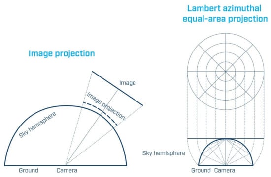 At each observation time, both cameras take 61 photos of the sky, at a pre-defined angles and azimuths. In the first step of the processing, these images are stitched together, using the method of Lambert azimuthal equal-area projection from the hemisphere to the horizontal plane (Figure 4). The selection of an equal-area projection is important, as the ratio of the cloud surface to the whole sky surface in reality must be exactly the same as the ratio in the whole sky image [9].