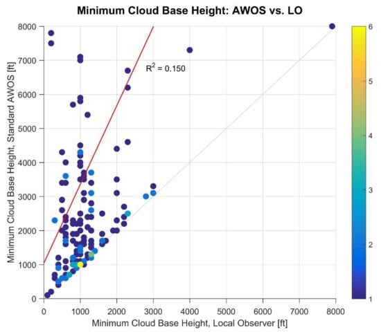 The data sets of the lowest cloud base are presented in the form of scatter plots in Figure 7 and Figure 8. In order to allow for a better visual comparison, the y-axes of Figure 7 was cut at 8000 ft (1 ft~0.3 m), instead of displaying the outliers of the AWOS values exceeding 10, 15, and sometimes 24 thousands of feet (associated with LO data from the interval 800 to 3000 ft). Note that cloud base height is expressed in non-metric units (ft), due to the convention of their usage in aviation.
