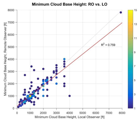 There is another specific feature of the current analysis, and it is related to the fact that the target destination is surrounded by mountains (the High Tatras in the north). Consequently, Steps #1–3 to determine the cloud base height (described in Section 2.2) can be performed with no limitations. In sites with no mountains or tall country features nearby, however, Step #2 has to be skipped. In such case, the LO is restricted to only follow Steps #1 and #3, and naturally, the same also holds true for the RO. This might lead to different results. Unfortunately, we have not received data from a different airport without mountains or tall features to verify the consequences of (the lack of) the particular settings. Nonetheless, we expect that both the local and the remote observers would be influenced in a similar way, as in the case of a non-mountainous airport, both LO and RO would suffer in the absence of Step #2.