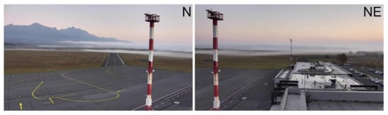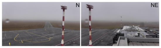 At the time of measurement (04:50 UTC), the standard AWOS was covered by some fog patches; therefore, it indicated medium range visibility of 4200 m (Table 11). On the contrary, the remote observer, with the help of camera images, was able to see the entire horizon, and consequently, was able identify different visibility conditions in different directions, with minimum visibility towards the east (Table 11). The same was observed by the LO. Fog with patches (BCFG) was observed between 02:00 and 5:30 UTC, then it changed to VCFG, i.e., fog in the vicinity, and it disappeared at about 08:00 UTC.
