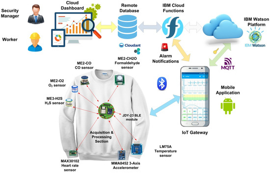 Moreover, a custom mobile application installed on the user’s smartphone enables the smart garment to connect to the Internet even when a WiFi hotspot is not accessible, such as in remote outdoor locations. The collected data are forwarded to the IBM Watson IoT cloud platform in the form of JavaScript Object Notification (JSON) through Message Queue Telemetry Transmission (MQTT), enabling remote data collection, processing, and storage. Indeed, the platform provides an easily expandable architecture that allows the simple addition of additional services, such as the IBM Cloudant service, a database management system optimized for managing a large number of mobile devices (Figure 1). The database is used for storing data from smart devices, along with the worker’s actual GPS coordinates provided by their smartphones. Furthermore, the acquired data are analyzed by the IBM Cloud Functions service to detect anomalies in the acquired data, in which case, alarm messages are sent to the database of the on-cloud application and a notification to the company’s safety manager and the worker. The smart garment also includes signaling devices (e.g., LEDs) and a vibration generator to immediately warn the user when abnormal parameters (e.g., high gas concentrations) are detected.