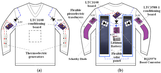 Graphical illustration of the multisource energy harvesting section, which shows the connections between the harvesters and conditioning modules integrated into the garment. Front view (a) and rear (b) views of the designed garment with highlighted the harvesting section.