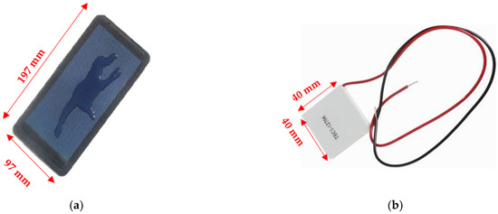 Furthermore, the smart garment is energetically autonomous thanks to an integrated multisource energy harvesting system, enabling the scavenging of energy from sources associated with the human body [42,43]. Two thin-film flexible photovoltaic cells (model 0.125 W 5 V-45 ∗ 25, manufactured by Dongguan New Energy Technology Co., Dongguan, Guangdong, China) are positioned on the user’s back to convert incoming light energy (solar or artificial) into electrical energy (Figure 3b). These photovoltaic panels are characterized by 1 W maximum power, 1.5 V operating voltage, 1200 mA short-circuit current, 2 V open-circuit voltage, and 197 mm × 97 mm × 0.8 mm dimensions (Figure 4a). A conditioning section based on the LTC3108 IC (produced by Linear Technology, Milpitas, CA, USA) is employed to scavenge energy from the two photovoltaic panels connected in series (Figure 3b). Through a 1:90 external step-up converter, the LTC3108 IC can be configured as a flyback converter that allows a minimum input voltage of 22 mV. A series of three TEGs (model TEC1-12706, manufactured by Thermonamic inc., Jiangxi, China) is placed on each forearm to scavenge the thermal energy produced by the body to achieve a larger thermal gradient (Figure 4b) [44]; elastic bands maintain contact between the TEGs’ hot joints and the skin. The used TEG model has 40 mm × 40 mm dimensions, 127 p–n junctions, and a weight of 15 g.