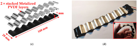Similarly, two LTC3108-based modules are installed on the garment’s sleeves to scavenge energy from the two series of TEGs; all LTC3108 stages are configured to 3.3 V output voltage. Additionally, two flexible piezoelectric harvesters are placed in correspondence to the user’s elbows to convert the kinetic energy associated with the limb movements. The piezoelectric harvesters consist of 3D-printed flexible supports with a corrugated profile (160 mm × 20 mm × 7 mm—at the peak of corrugation), realized using TPU filament (with hardness 80 Shore A), on which is deposited a stack of two PVDF layers (model 3-1004346-0, manufactured by TE Connectivity Measurement Specialities Inc., Schaffhausen, Switzerland) connected in series by means of epoxy glue (Figure 4c,d). The resulting device is highly flexible (also due to its corrugated profile), resilient, and lightweight (10 g), making it unobtrusive to the user’s movements. Lastly, a nylon cover was applied to the transducer to protect the surface of the polyvinylidene fluoride (PVDF) layers. For convenience, the two harvesters are fixed to joints by elbow pads for improving the mechanical coupling with the body. Two LTC3588-based modules (manufactured by Linear Technologies Co., Milpitas, CA, USA) are used to scavenge energy from the two piezoelectric harvesters. The LTC3588-1 integrates a low-loss rectifying bridge and a configurable DC output voltage set to 3.3 V for the two piezoelectric harvesting stages, making it well-suited to collect energy from alternate sources (Figure 3a).