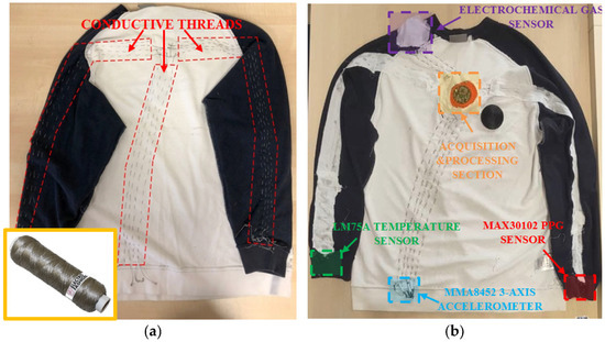 Images of the garment interior: electrical connections sewn to the fabric using stainless steel thread (a) and the distribution of sensors and electronic modules (b).