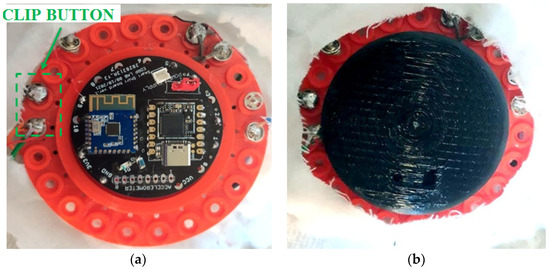 Details of the MCU board fixed on the garment by plastic support, with the connections terminated by clip button (a); plastic protective cover (b).