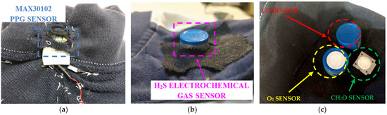 Details of the smart garment: MAX30102 PPG sensor fixed on the sleeve (a) and electrochemical gas sensors placed on the shoulders: H2S (b) and multisensor (c) modules.