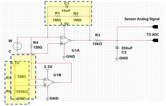 Specifically, the circuit solution used for conditioning the current signal provided by the H2S sensor is depicted in Figure 12, which is essentially a potentiostatic circuit for three-electrode sensors. The conditioning circuit comprises a transimpedance stage (based on Ut opamp), which converts the current signal into a voltage signal, and a further operational amplifier (Up) in a potentiostatic configuration to fix the d.d.p. between the RE and WE.
