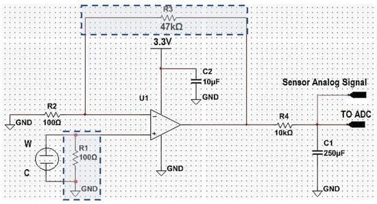 For the CO and CH2O sensors, potentiostatic stages for two-electrode sensors are employed. In this circuit configuration, a voltage buffer fixes the d.d.p. between the CE and WE (Figure 9). In addition, a load resistor RL between WE and CE is needed, which constitutes an RC smoothing filter with an intrinsic sensor capacitance for reducing the output noise. In addition, the value of load resistance affects the response time of the sensing module in the presence of gas. The manufacturer suggests load resistances between 120 Ω and 300 Ω for both sensors [35,36].