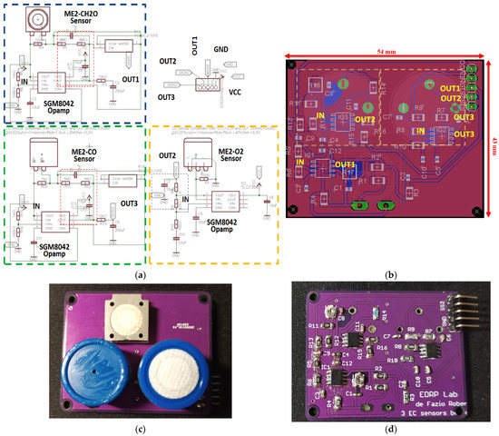 Schematic (a), layout (b), and PCB top (c) and bottom (d) views of the conditioning board of the ME2 family sensors. Diagrams were realized with Eagle CAD software.