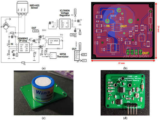 Schematic (a), layout (b), and PCB top (c) and bottom (d) views of the ME3-H2S sensor’s conditioning section. Diagrams were realized with the Eagle CAD software.