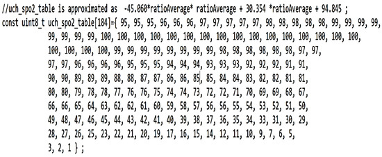 The implemented firmware for the SpO2 calculation does not use the previous formula but rather the function , implemented by the approximation array shown in Figure 15, which numerically approximates the function.