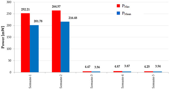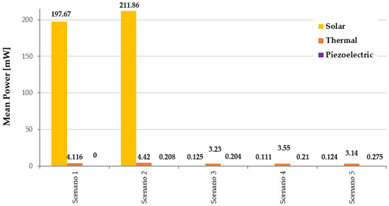 Several field tests were carried out to assess the effectiveness of the multisource harvesting system integrated into the smart garment when it was worn by a user and in various operational conditions, described in Table 2. Specifically, for testing the harvesting function, five different operational conditions were considered, characterized by different illuminance values and source typologies, thermal gradients between the skin and air, and performed activities. In scenarios 1–2, the user was exposed to direct sunlight, and in scenario 3, he was in indirect sunlight. In contrast, in scenarios 4–5, the user was in an indoor environment under an artificial light source (neon light). The reported illuminances and thermal gradients were calculated as mean values over an observation interval of 30 min. Furthermore, in scenario 1, the user was steady, whereas, in scenarios 2–4, he walked at a mean speed of 5 km/h. In scenario 5, the user performed pushups with a repetition frequency of 0.5 Hz.
